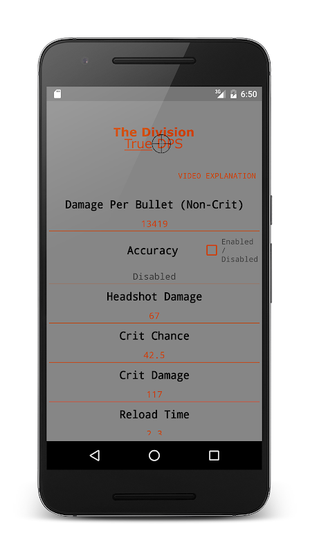 While doing a bit of research on why my DPS didn't quite seem right while playing "The Division" I came across a video that "Skill Up" has put up on YouTube, that explained why that is and how to calculate the exact DPS of your current weapon / stats. I used his math in the creation of this app to make it a bit more convenient for all of you Android agents. I really hope this helps you get the best setup possible, so you can own some noobs in the Darkzone.