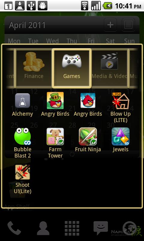 App Shelf allows you to organize your applications quickly and easily. The applications organization is automatically performed depending on the categories in Google Android Market. The application allows you to change the organization according to your wishes. In order to have quick access to the groups you should add desktop shortcut from the appropriate menu (desktop context menu -> Shortcuts).