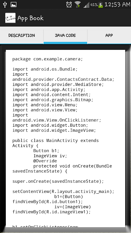 - The app consists of thee views for each topic. (Description , Appcode , App)