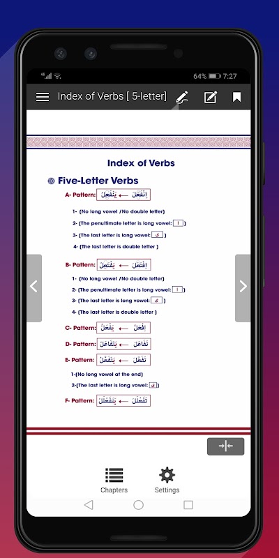 این برنامه یک کتاب الکترونیکی تعاملی است که شامل صدها فعل رایج عربی (5 حرفی و 6 حرفی) است که بر اساس الگوهای آنها به گروه هایی تقسیم شده و در جداول به گونه ای ارائه شده است که به راحتی قابل حفظ و به خاطر سپردن است.