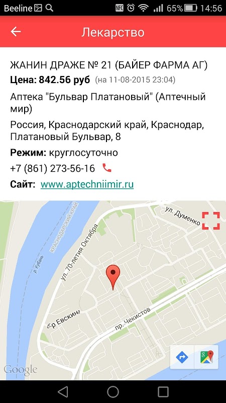 - пользователю предоставляется исчерпывающая информация по каждой аптеке (название аптеки и сети, адрес и месторасположение на карте, график работы, дата и время обновления товаров в базе, контактные телефоны с функцией быстрого набора номера из приложения, информация о скидках и акциях, возможности заказа и доставки);