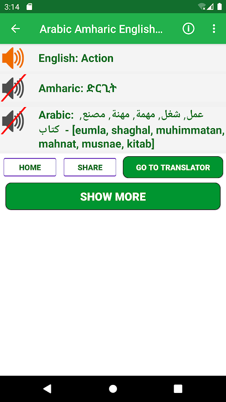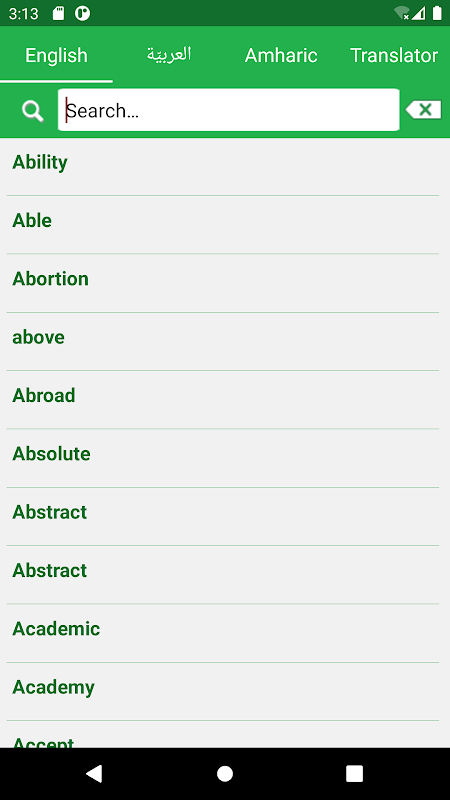 وقتی اینترنت ندارید می توانید از این فرهنگ لغت استفاده کنید. شما می توانید با استفاده از صفحه کلید آمهری یا عربی جستجو کنید و برای هر کلمه ترجمه عربی و آمهری دریافت خواهید کرد.