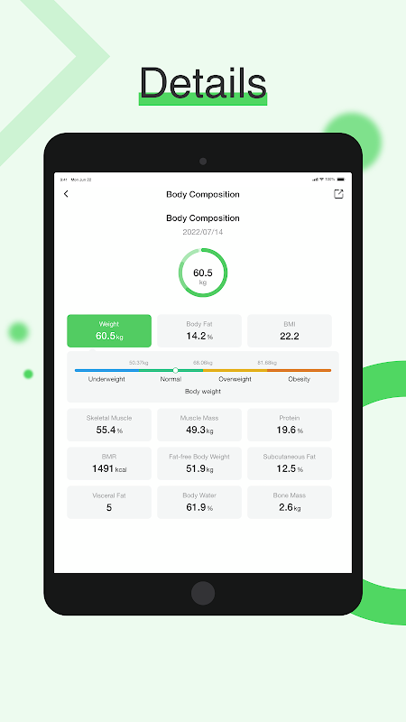 برنامه Arboleaf و مقیاس هوشمند شما را برای ردیابی سلامت، تناسب اندام و تعیین اهداف شما آسان تر می کند. گام در مقیاس هوشمند، شما می توانید داده های ترکیب بدن خود را از جمله: