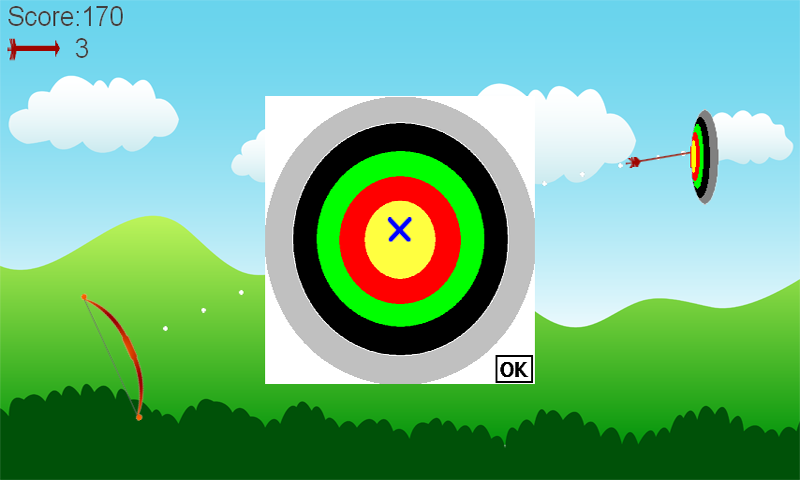 In addition, There is a challenge of shooting with eyes covers; when you touch the bow the screen gets dark and you won't see the target; now you should remember where was the target place and try to shoot to that place.
