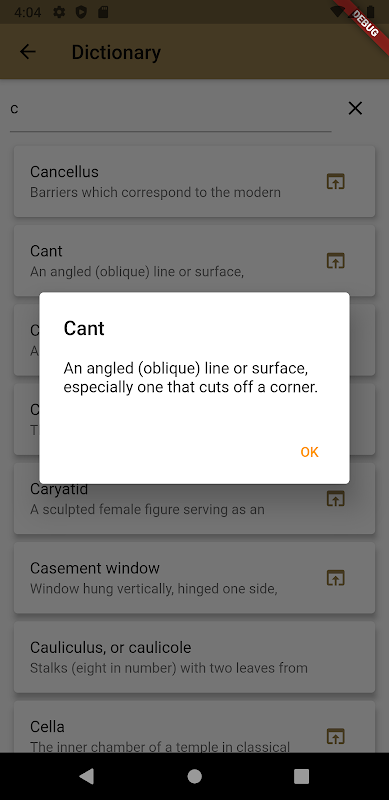 شرایط معماری یک مرجع سریع و ابزار یادگیری برای دانش آموزان و سایرین است که در حال یادگیری معماری هستند. این اصطلاحات شامل تعاریف ، پیوندها به مقالات طولانی تر در ویکی پدیا ، و تمرینات راهنمای انتخاب شده توسط شما است. این برنامه چندین روش برای یادگیری دارد از جمله: