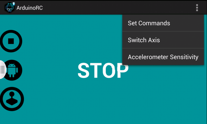 علاوه بر این، گزینه های منو ارائه یک دکمه تغییر حساسیت به تغییر نقطه ای که برنامه جلب رویدادی ژست برای این حالت. همانطور که از عنوان آن پیداست، این حالت به طور خاص طراحی شده برای کنترل از راه دور یک وسیله نقلیه که با استفاده از یک ماژول بلوتوث و میکروکنترلر.