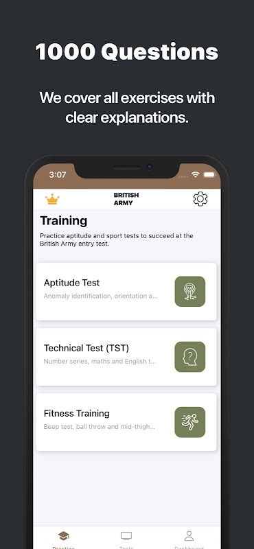 سلب مسئولیت: ما به وزارت دفاع بریتانیا، ارتش بریتانیا یا هیچ سازمان دولتی دیگری وابسته نیستیم. این برنامه برای کمک به داوطلبان برای آماده شدن برای آزمون های آمادگی شناختی و آمادگی جسمانی طراحی شده است. برای اطلاعات رسمی، لطفاً به وب سایت وزارت دفاع انگلستان در اینجا مراجعه کنید: https://jobs.army.mod.uk/how-to-join/army-assessment/soldier/