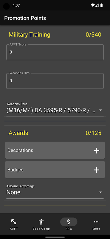 Army Fitness Calculator یک ماشین حساب ACFT است که به شما امکان می دهد نمرات خود را با نوار لغزنده، دکمه های افزایش/کاهش یا با تایپ مقادیر خام خود برای محاسبه رویداد و امتیاز کلی خود وارد کنید. این برنامه همچنین یک جدول کامل از نمرات برای جنسیت و سن شما و یک راهنمای برای کمک به راه اندازی نوار هگز برای رویداد Maximum Dead Lift تولید می کند.