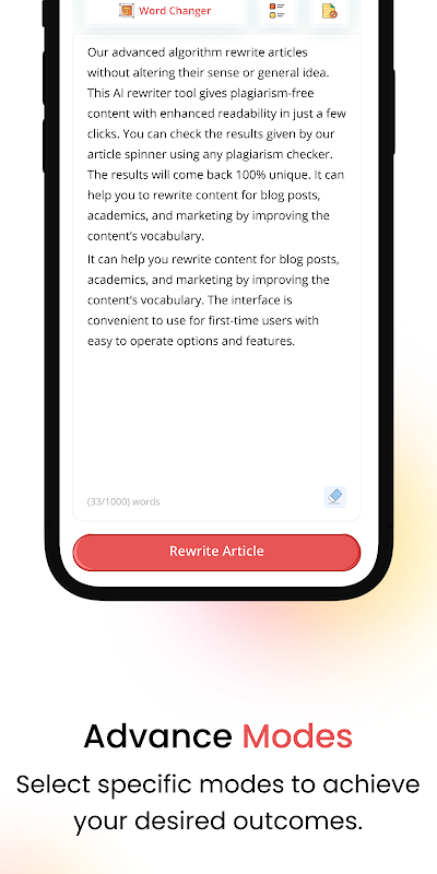 اپلیکیشن بازنویسی مقاله با حالتهای بازنویسی متعددی از جمله تغییردهندهی کلمات، بازنویسی جمله و بررسیکنندهی سرقت ادبی ارائه میشود. علاوه بر این، ابزار بازنویسی ما به شما امکان میدهد متن را در حالتهای روان، استاندارد و خلاقانه بازنویسی کنید.