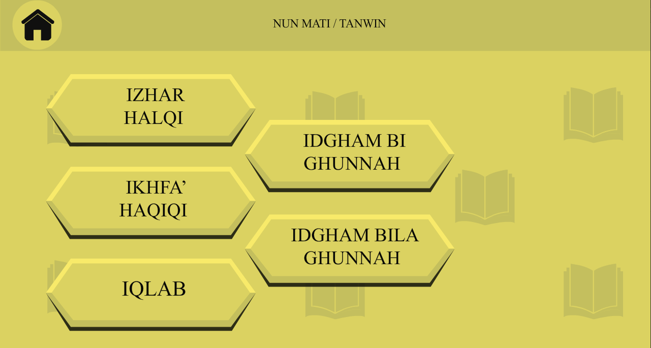 این برنامه اصول اولیه علم tajwid را می آموزد که عبارت است از نامه hijaiyah ، راهبه می میرد یا تانوین و تقلید می میرد. نمونه هایی از جملات و نحوه درست خواندن را نشان می دهد. صدا و فیلم نیز برای کمک به تقویت این برنامه ارائه شده است.