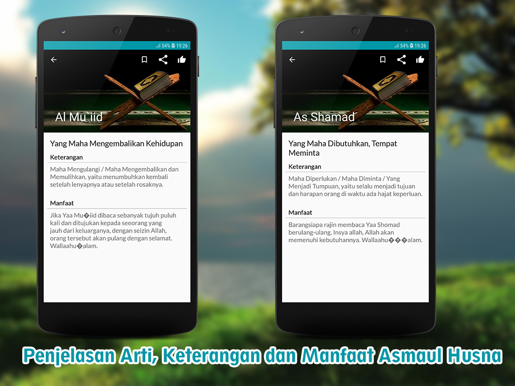 از این برنامه Asmaul Meaning and Meaning می توان برای خواندن ، درک و درک مزایای Asmaul Husna برای شما آسان تر کرد. این نرم افزار Asmaul Husna با Audio با صفحه نمایش آسان برای استفاده ساخته شده است بنابراین شما می توانید 99 اسم خوب و زیبای Asmaul Husna Allah SWT را به خاطر بسپارید.