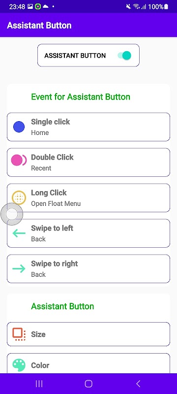 این از چندین رویداد برای دکمه دستیار پشتیبانی می کند به عنوان: تنها کلیک ، دوبار کلیک ، طولانی ، کش رفتن به سمت چپ ، کش رفتن به سمت راست.