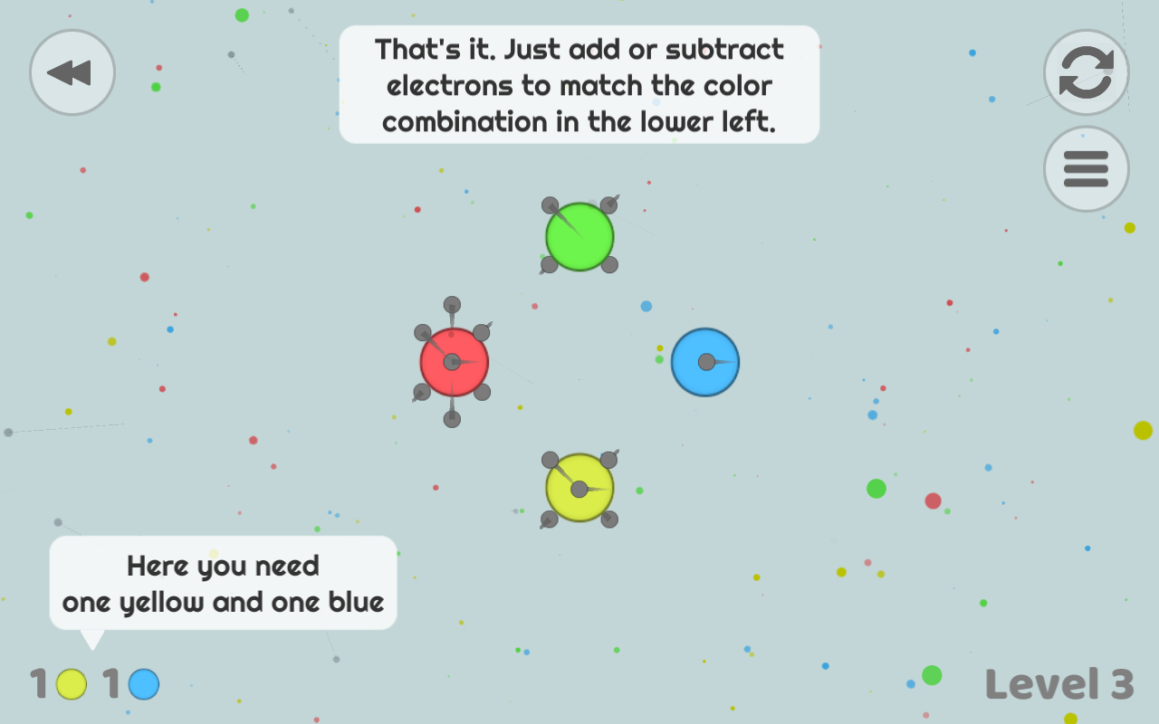 In puzzle mode, add or subtract electrons to change an atom's color. Match the level's color key to pop all the atoms.