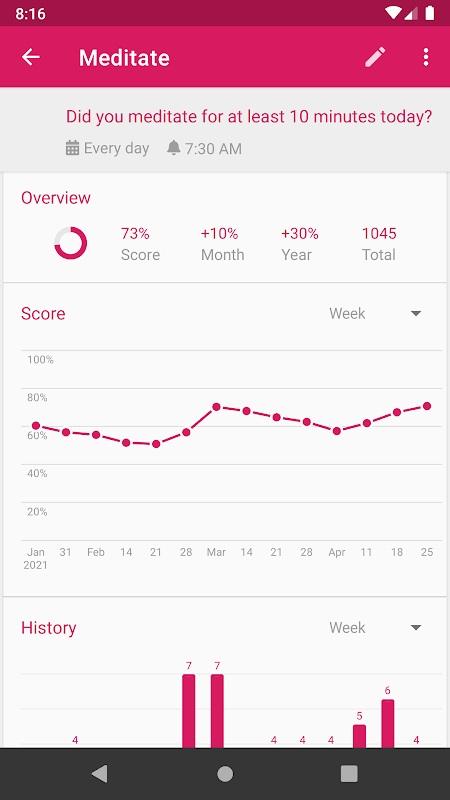 آمار جامع: با نمودارها و آمارهای دقیق، بینش ارزشمندی در مورد پیشرفت خود به دست آورید. در کل تاریخچه عادت خود حرکت کنید تا شاهد بهبود خود در طول زمان باشید.
