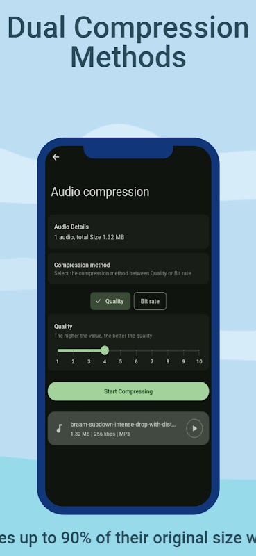 "کمپرسور صوتی" راه حل مناسبی برای هر کسی است که به دنبال کاهش حجم فایل های صوتی خود به سرعت و به راحتی است. این برنامه فرآیند فشرده سازی فایل های صوتی MP3، AAC، M4A، MP2 و AC3 را به راحتی ساده می کند و به شما کمک می کند فضای ذخیره سازی ارزشمندی را در دستگاه خود ذخیره کنید بدون اینکه کیفیت صدا را به خطر بیندازید. رابط کاربر پسند آن یک تجربه فشرده سازی یکپارچه را تضمین می کند و به شما امکان می دهد فایل های صوتی خود را تنها در چند مرحله ساده کوچک کنید. صداهای فشرده مورد علاقه شما