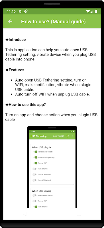 این برنامه به صورت خودکار تنظیم شده است تنظیم تنظیم اتصال به اینترنت USB ، لرزش دستگاه ... و غیره هنگامی که شما کابل USB را وصل یا وصل می کنید.