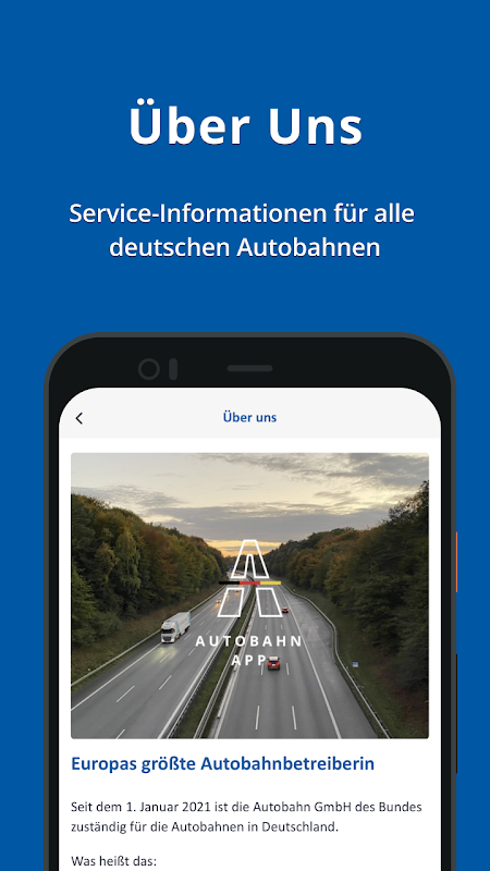 برنامه Autobahn برای کاربران بزرگراه های آلمانی است که به دنبال اطلاعات قابل اعتماد اضافی در مورد بزرگراه های فدرال علاوه بر گزینه های موجود در برنامه ناوبری مورد استفاده خود هستند. به ویژه کاربران مکرر، مانند مسافران یا رانندگان حرفه ای، اطلاعات اضافی ارزشمندی در مورد وضعیت ترافیک فعلی و سایت های ساخت و ساز برنامه ریزی شده و فعلی دریافت می کنند. بسته شدن جاده ها نیز در برنامه یکپارچه شده است. این برنامه همچنین می تواند مستقیماً به برنامه ناوبری شخصی شما مرتبط شود.