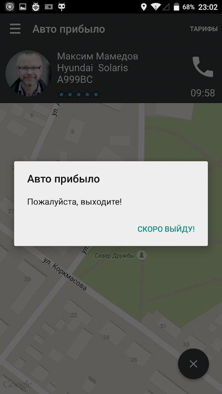 - приложение показывает ФОТО и персональный рейтинг водителя, а также госномер и модель автомобиля;