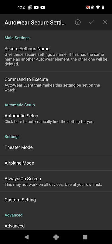 AutoWear از سرویس دسترسی ساعت شما استفاده میکند تا به شما امکان دهد ضربهها و سایر تعاملات رابط کاربری را از طریق Tasker شبیهسازی کنید! نکته مهم: سرویس دسترسی AutoWear فقط برای اهداف اتوماسیون استفاده میشود و به هیچ وجه دادههای شما را جمعآوری یا به اشتراک نمیگذارد.