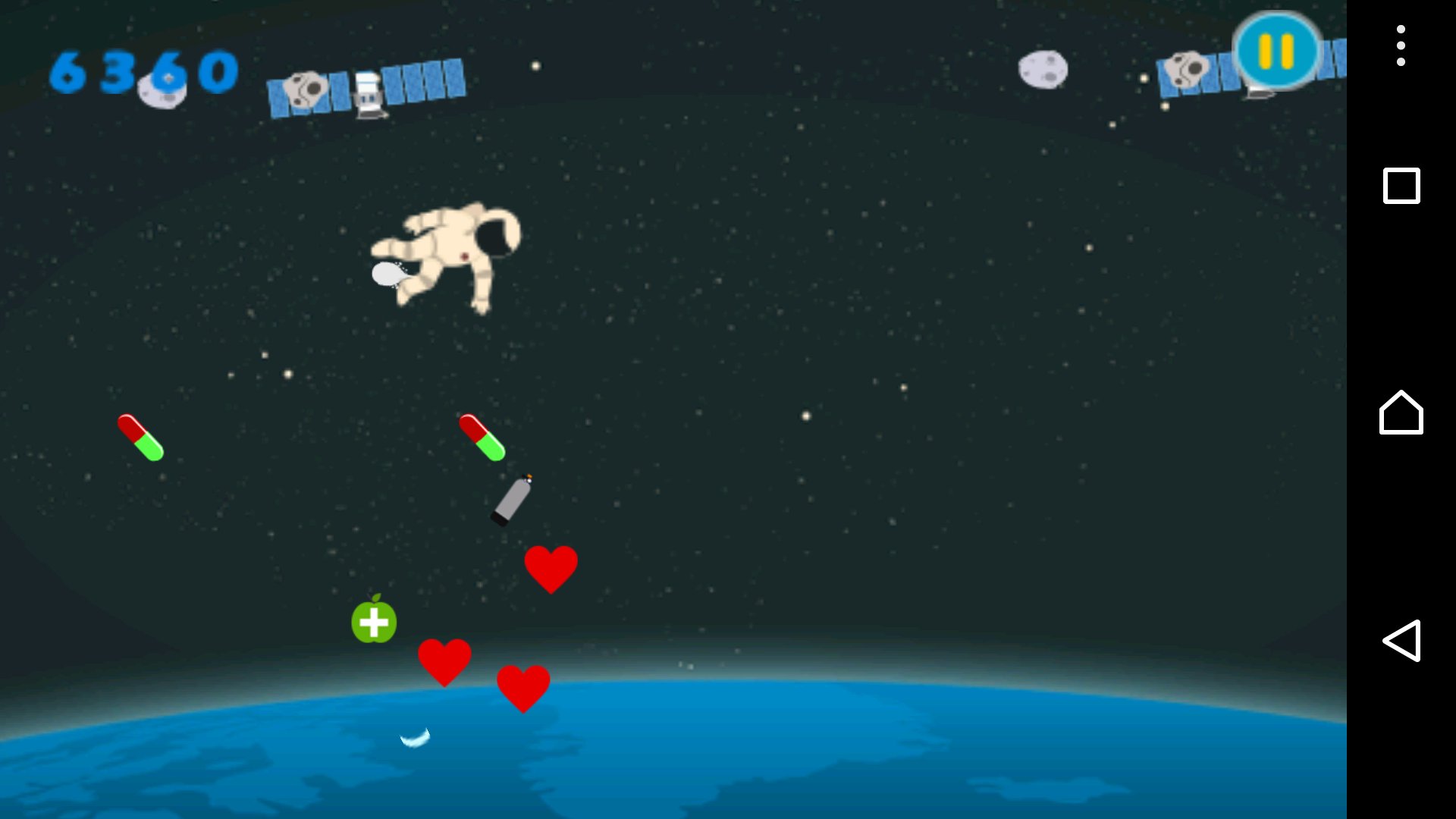 The power you have is gravity of earth and the air bottle to swimming in space you have to collect the life resources from the leftover y the others spacecraft like oxygen O2 and air bottle to stay travelling and you have also avoid the nuclear stuff who can kill you or loss your consciousness