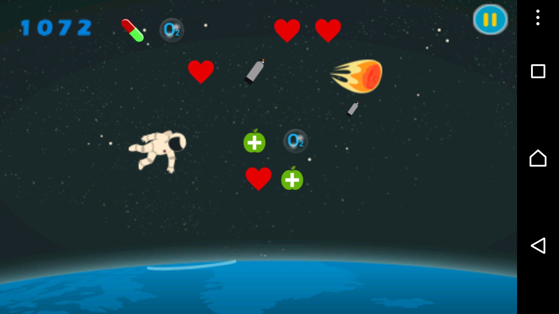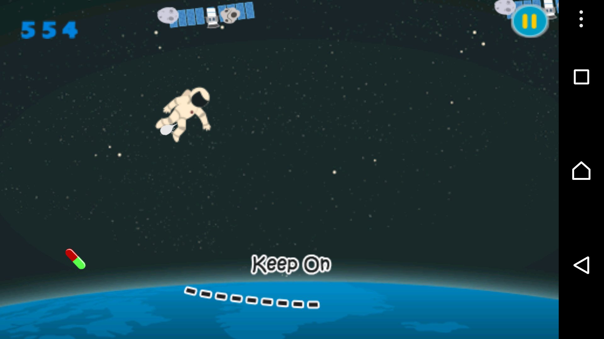 You must help astronaut by drawing the airlines (obstacle) under the cosmonaut to keep him in save zone from the power of gravity and fall down in the atmosphere and burring, to collect some surviving staff and to cling in the little shooting star to give you the speed to find you spaceship and survive