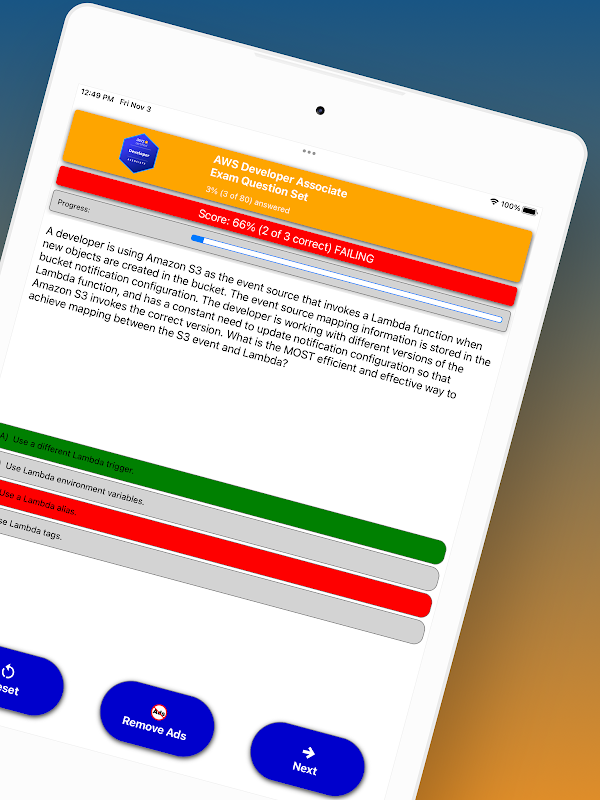 هر سوال بازخورد فوری و پاسخهای صحیح ارائه میدهد و به شما کمک میکند تا به طور موثر یاد بگیرید و روی مباحث کلیدی دستیار توسعهدهنده AWS تمرکز کنید.