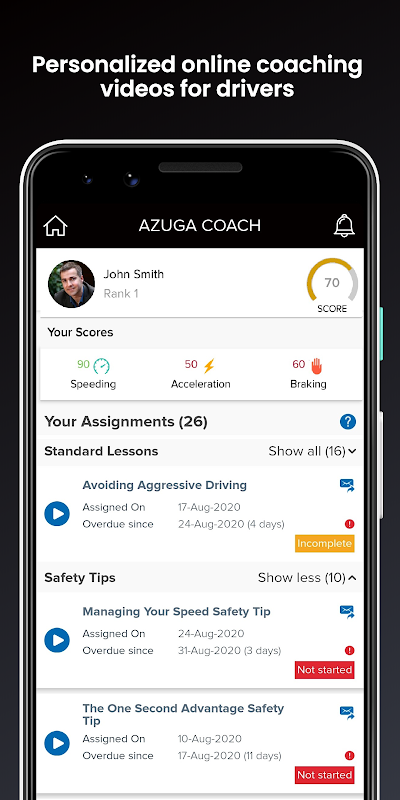 & # 8226؛ نمرات ایمنی را ردیابی کنید. رانندگان می توانند در نمرات ایمنی خود زبانه ها را نگه دارند ، ببینند که چگونه در برابر یکدیگر جمع می شوند و خود را مربی می کنند تا رانندگان ایمن تر و کارآمدتری شوند. سرپرستان می توانند همان نمرات و تابلوهای راهنما را مشاهده کنند تا ببینند رانندگان در پشت فرمان چقدر خوب عمل می کنند و چه رفتارهای رانندگی نیاز به کار دارند ، از لپ تاپ ، تلفن همراه یا رایانه لوحی.