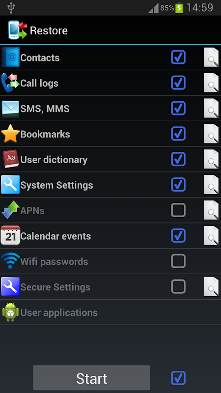 Application can backup and restore: Contacts, SMSes, MMSes, Call logs, System settings, Secure system settings, Wifi passwords, User dictionary, APNs, Calendar events, User applications, Bookmarks and browser history.