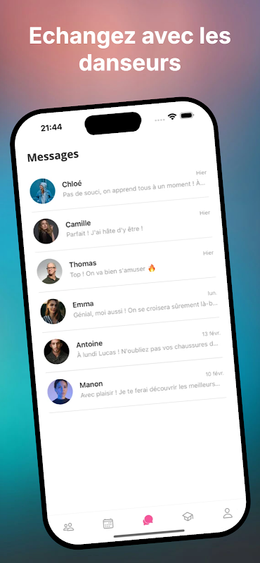 شریک رقص خود را پیدا کنید. با استفاده از جستجوی لیست یا نقشه تعاملی، پروفایلهای رقصندگان نزدیک خود را مرور کنید. بر اساس سبک رقص، سطح، نقش (رهبر/دنبالکننده)، جنسیت یا فاصله فیلتر کنید. ببینید چه کسی آنلاین است و با یک ضربه پیام ارسال کنید.