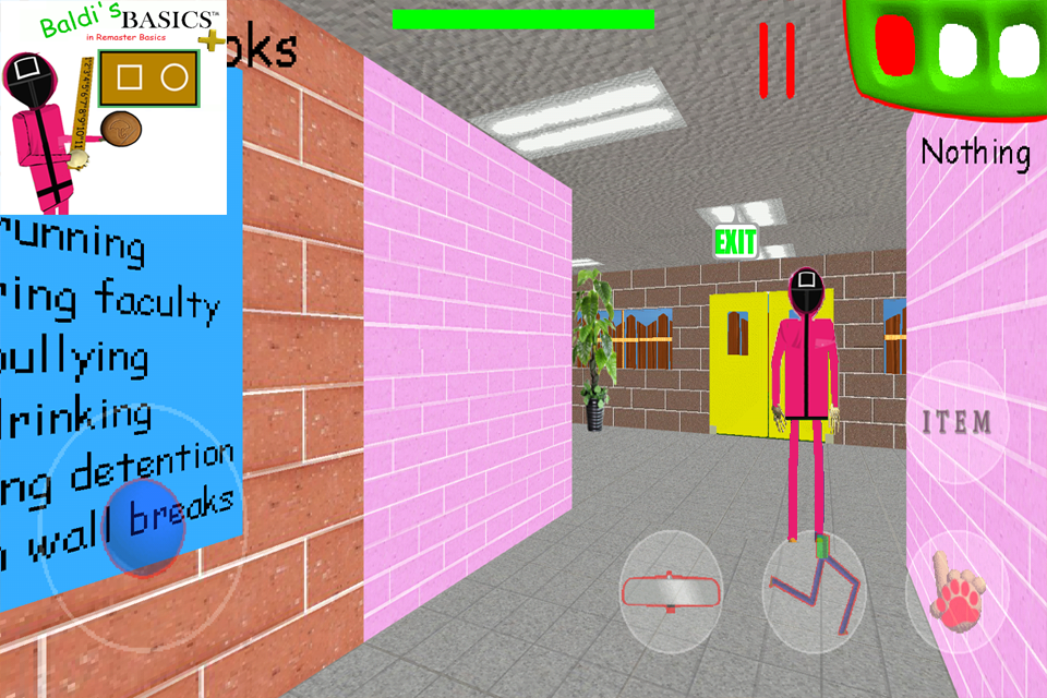 Baldi's Basics Squid Game Mod games is an edutainment parody meta horror game that tasks the player with collecting notebooks, all the while trying to avoid Baldi. Story mode requires you to collect 7 notebooks and then escape the school to win. The more notebooks you collect, the faster Baldi's will become! Simple, but very challenging.