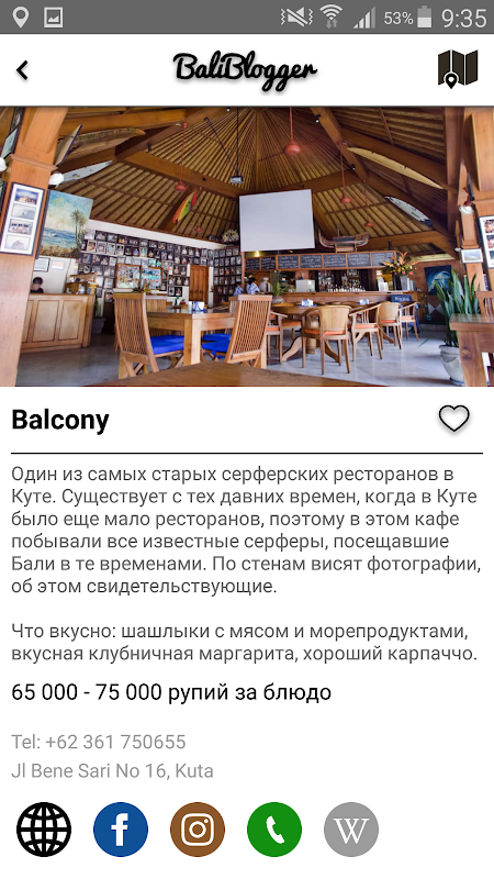 All that is included in this guide were selected manually by the author BaliBlogger.ru and to every place of the descriptions and photos, ratings, and the order price, the location on the map, contacts and more. Lists and descriptions of places saved on your phone and will be available even without the Internet. All locations are mapped and easy to find. And in the latest version of the navigation also available.