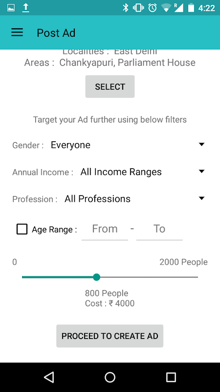 Target : Select the City and Area where you want to advertise. Filter customers as per Gender, Age, Profession etc.