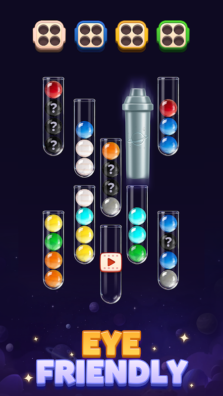- دستاوردها را جمعآوری کنید: بطریها را با سیارات همرنگ پر کنید تا «جعبههای هدیه سیاره» را باز کنید و مدالهای انحصاری کسب کنید!