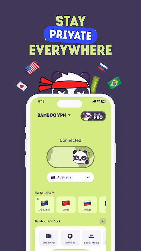 با BambooVPN، تعادل کاملی از عملکرد سریع رعد و برق و حفظ حریم خصوصی را به دست می آورید، همه در یک برنامه کاربردی آسان.