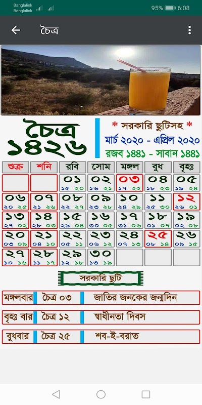 این تقویم بنگلا 1426، تقویم انگلیسی 2019 و برنامه 1440 تقویم عربی است. شما می توانید جزئیات این تعطیلات را از این APK تقویم بنگلا دریافت کنید شما روز و تاریخ روز افزونی صفحه تعطیلات دولتی خواهید داشت. این برنامه تقویم بنگلا همچنین شامل شش فصل بنگلادش است. فصل ها تصاویر مرتبط هستند. اگر می خواهید تمام این اطلاعات را در یک برنامه دریافت کنید، سپس این برنامه را دانلود کنید و آن را در گوشی خود نگه دارید.