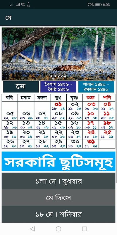 این تقویم شامل تاریخ 2019 با تعطیلات دولتی بنگلادش است. همچنین شامل تقویم بنگالی 1425 تا تقویم بنگالی 1426 و تقویم عربی 1440 تا تقویم عربی 1441 است. همه این تقویم برای بنگلادش ساخته شده است. فقط مردم بنگلادش باید این برنامه را نصب کنند.