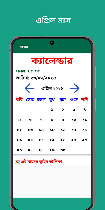 Bangla Calendar 2026 یک برنامه تقویم است که مخصوص کاربران بنگالی زبان طراحی شده است. برای سهولت استفاده، ساده، واضح و به طور کامل به زبان بنگلایی نمایش داده می شود.