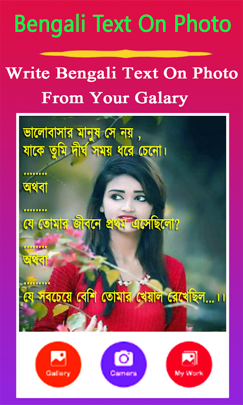 With this Bengali text on any photo create you can generate the best Bengali poems, shayari and share them with your friends and family via FB,whats up Messenger, E-mail, Massage or any other social media.