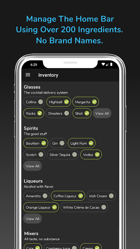 BarBack اهمیتی ندارد که شما روی هر یک از مواد مورد بحث نام یا برچسب خاصی داشته باشید. "Rum" می تواند به معنای مارک مورد علاقه شما یا فقط مارک فروشگاهی باشد که اتفاقاً در دست شماست ، بنابراین آنچه مهم است نوشیدنی است - نه نام. به آن فکر کنید مانند یک تعویض هوشمند داخلی که می توانید خودتان انجام دهید. BarBack متمرکز بر این است که تجربه کوکتل شما به ساده ترین شکل ممکن باشد ، بنابراین در اینجا هیچ اسنوبریستی با مارک را پیدا نخواهید کرد!