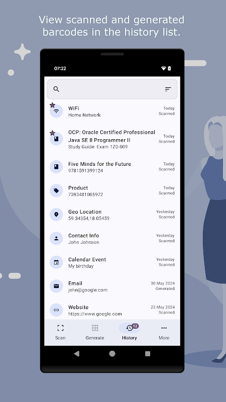 اقدامات بارکد برای سهولت استفاده، به عنوان مثال. جستجو، باز کردن وب سایت و موارد دیگر. بارکدهای اسکن شده یا تولید شده را در بخش تاریخچه مشاهده و جستجو کنید، بارکدهایی را که مهمترین آنها را میدانید مورد علاقه قرار دهید یا یادداشتهایی اضافه کنید. داده های بارکد را هم در حالت خوانا و هم در مقدار خام مشاهده کنید. به طور خودکار بارکد حاوی داده های هر بارکدی را که اسکن می کنید تولید کنید، تصویر بارکد را به سیستم فایل خود صادر کنید.