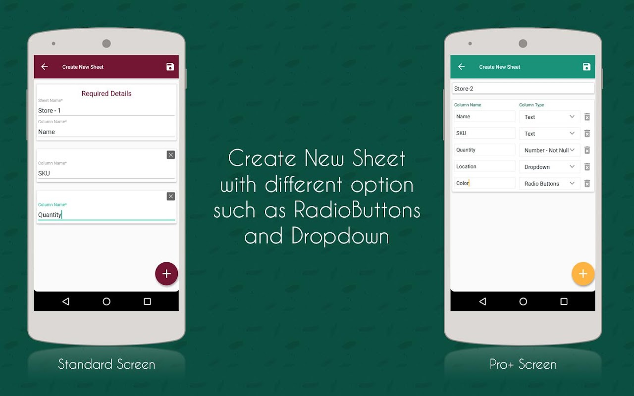 در ردیف سفارشی و ستون: هدف از این برنامه این است که ورود اطلاعات آسان تر است. اضافه کردن سطر و ستون در فرم های سفارشی به عنوان ساده به عنوان آن در CSV و یا اکسل ورق انجام می شود. داده ها را می توان به صورت دستی وارد و یا می تواند به طور خودکار انجام شده توسط فقط آیکون اسکنر برای اسکن و وارد کردن داده ها در قالب فشار دهید.