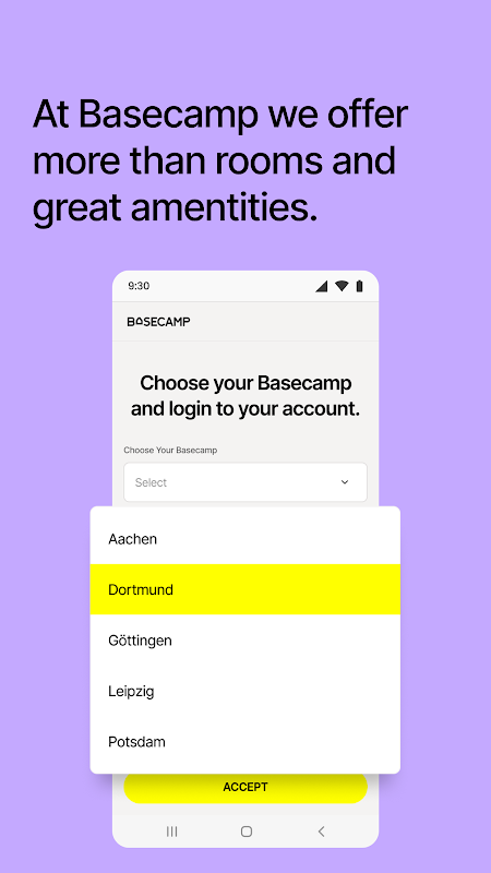 Basecamp یک برنامه برای تلفن های هوشمند اندرویدی است که برای استفاده در ساختمان های دانشجویی Basecamp طراحی شده است. این عملکردهای ضروری را به Basecamper ارائه می دهد، از جمله:
