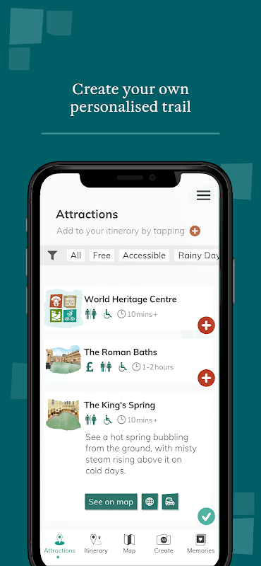 بسته به جایی که هستید می توانید مسیرهای خود را با انتخاب مکانهایی که می خواهید از آنها به سه روش مختلف بازدید کنید ، ایجاد کنید. اگر در مرکز میراث جهانی در حمام هستید ، می توانید پین های نقشه را که در آنجا یافت می شود اسکن کنید. اگر قصد سفر خود را از خانه دارید یا در حال حاضر در حمام هستید ، روی پین های نقشه روی نقشه درون برنامه ای ضربه بزنید یا می توانید مقصدها را از لیست جاذبه ها اضافه کنید.