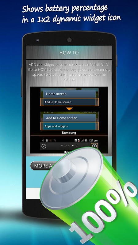 With our simple interface and beautiful design you will get both beauty and functionality. Decrease battery consumption with one simple ''widget app''. After you download and install the app tap to open it and you will see the application instructions. Tap the widget panel and bring the ''battery widget'' to the home screen. It will automatically start displaying your phone battery percentage. Tap the battery widget and enter a menu with optimization options. There you can adjust the phone brightness, internet and location option. The quick optimize button will enable you to track your phone battery usage and disable all the apps that are draining your device power. Besides the useful functions this widget app is also showing the exact date and time. The simplicity and beauty of our user friendly interface will leave you breathless.