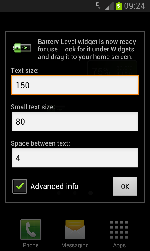 این ویجت سطح باتری های خیلی ساده و کوچک برای صفحه نمایش شما می باشد. این می تواند درصد باتری، دما و ولتاژ نشان می دهد. همچنین آن را نشان می دهد استفاده از باتری بر روی کلیک کنید. سابقه و هدف تغییر رنگ از سبز به قرمز، بسته به سطح باتری.