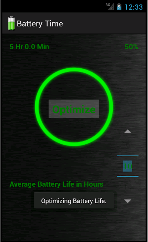 Save Battery Life on your Android. Simply click the "Optimize" circle of power and your Android battery will achieve max battery potential. This app also displays the time remaining on your battery in the top left corner. The top right corner contains the percentage of charge remaining on your battery. Select your average battery life in hours for your device from the picker to achieve best results. "Optimize" mode will turn off wifi and bluetooth as well as adjust screen brightness to maximize device battery. Great for idle times at work, while sleeping, on an airplane, or any occasion when battery life needs to be maximized.