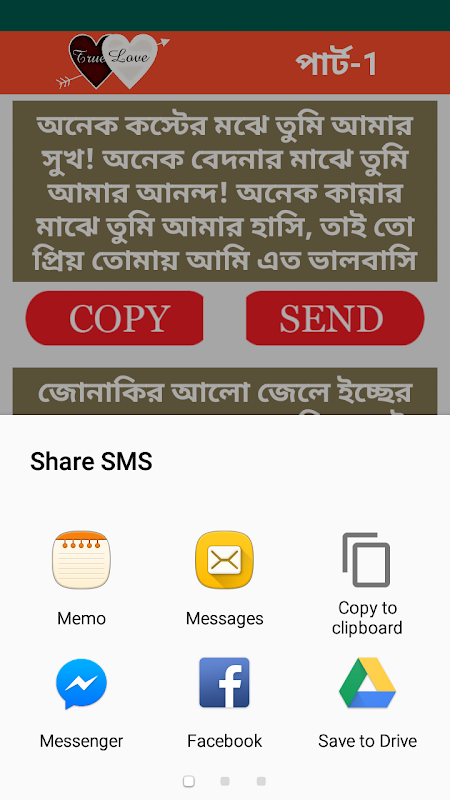 আপনার নিজের মনের কথা গুলি আপনার মনের মানুষের সাথে শেয়ার করার জন্য এখানের রয়েছে প্রায় ৫০০ শতাধিক রোমান্টিক বাংলা মেসেজ। আপনি যা বলতে চান হয়ত তা আপনি লিখতে পারছেন না সমস্যা নেই এই এপ্সটি আপনার ভালবাসার কথা মানের কথাগুলি ধারন করে রেখেছে। এখানে যেই লেখাটি আপনার পছন্দ হয় তার পাশের SEND বাটুনে চাপ দিলে আপনি সরাসরি ফেইজবুক, কন্টাক মেসেজ, ওয়টস আপ, ইমু ইত্যাদি মাধ্যমে অথবা Copy করে আপনার মনের মানুষের সাথে শেয়ার করতে পারেন।