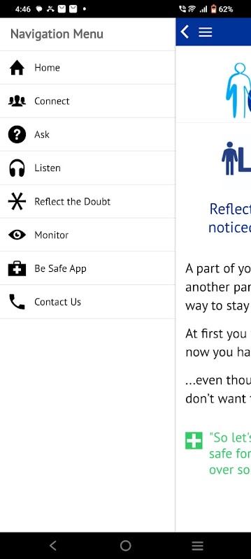 این برنامه به طور یکپارچه شما را از طریق مدل C-A-L-M، Connect – Ask – Listen – Monitor راهنمایی می کند. میتوانید در زمان کوتاهی از این برنامه برای حمایت از شما در زمانی که مداخلهای برای کسی که در فکر خودکشی است استفاده کنید. شما میتوانید شخص را راهنمایی کنید تا برنامه «ایمن باشید» را روی تلفن خود دانلود کند و خیالتان راحت باشد که میدانید برنامه ایمنی او مستند است و هر زمان که برای ایمن نگهداشتن به آن نیاز داشته باشد، در دسترس است.