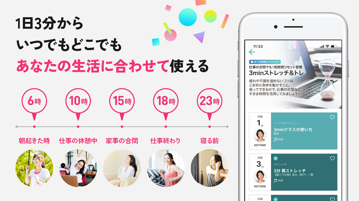 میتوانید روزی ۳ دقیقه در باشگاه، خانه یا بیرون از آن استفاده کنید. میتوانید صبحها که از خواب بیدار میشوید، در قطار شهری، در زمان تعطیلات کار یا کارهای خانه، روی تخت خود استفاده کنید. در حمام و شب ها روی تخت شما. در بالا، بیش از 900 کلاس در 12 ژانر که می توانند در هر زمان و هر مکان استفاده شوند، منتشر می شوند و هر ماه به روز می شوند.
