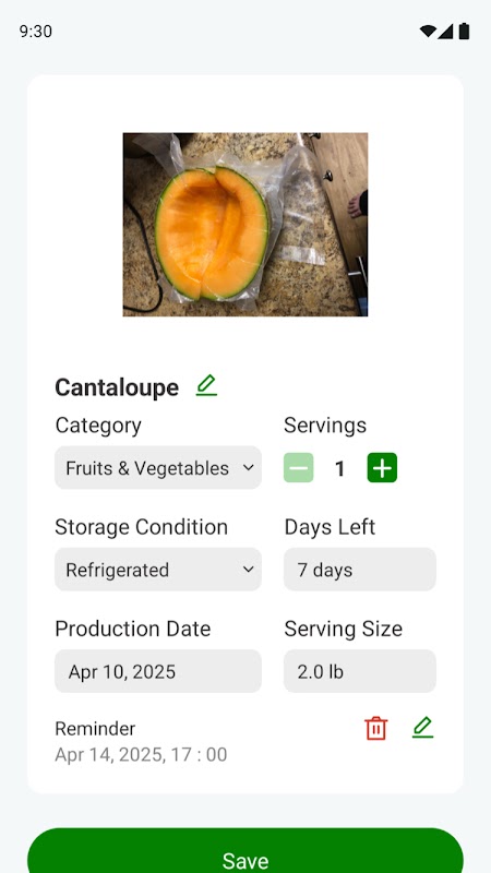 - ویرایش اطلاعات، تنظیم یادآورهای انقضای هوشمند (دریافت هشدارها 3+ روز قبل از انقضا)، و صرفه جویی - AI عمر مفید را بر اساس شرایط ذخیره سازی واقعی برای کاهش ضایعات مواد غذایی بهینه می کند.